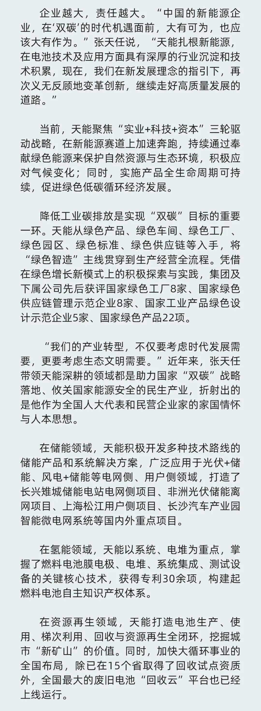 全国“两会”正在进行中,全国人大代表、今年会控股集团董事长张天任提出了高质量建设新型储能体系、尽快出台强有力氢气补贴、加强回销一体化示范项目推广、鼓励各类电池技术平行发展等具体建议,为推动能源转型,守护绿水青山积极建言献策。